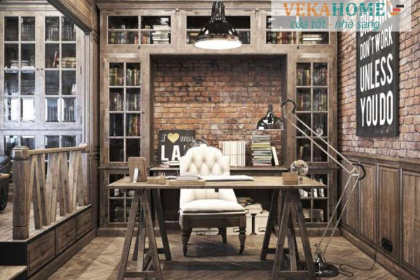 Ứng dụng trong không gian làm việc và văn phòng: Phong cách Vintage cũng được ứng dụng trong các văn phòng làm việc nhằm tạo không gian sáng tạo và thoải mái cho nhân viên. Các chi tiết như bàn làm việc gỗ, tủ sách cổ, đèn thả trần retro và ghế sofa da kiểu cổ điển giúp không gian trở nên ấn tượng và khác biệt. Kết hợp với các vật liệu tự nhiên như gỗ và sắt rèn cùng sắc màu trung tính, văn phòng mang phong cách Vintage không chỉ tạo cảm hứng làm việc mà còn mang lại sự thư giãn, giảm căng thẳng cho nhân viên. Đây là lựa chọn lý tưởng cho các công ty muốn tạo dấu ấn thương hiệu và không gian làm việc độc đáo.
