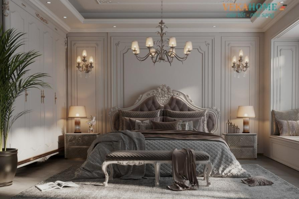 Phong cách tân cổ điển: Giường có kiểu dáng cao, đầu giường bọc nệm da hoặc nhung, trang trí phào chỉ nhẹ và chi tiết bo tròn mềm mại. Màu sắc thường là kem, vàng nhạt hoặc xám đậm, kết hợp với chất liệu gỗ tự nhiên. Kiểu giường này rất phù hợp với biệt thự, phòng ngủ master hoặc những ai yêu sự sang trọng và tinh tế.